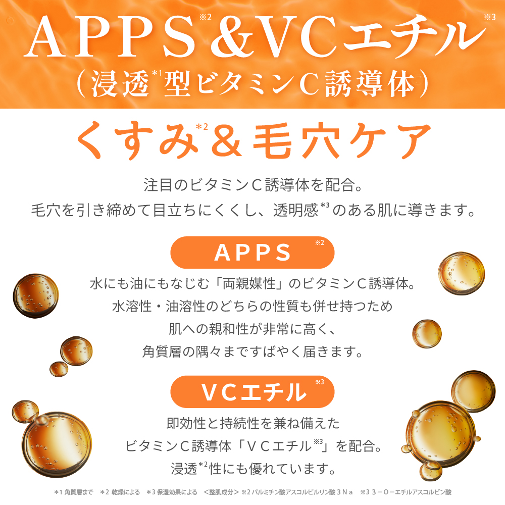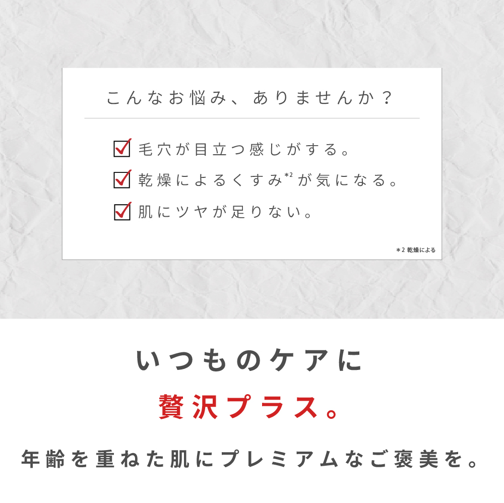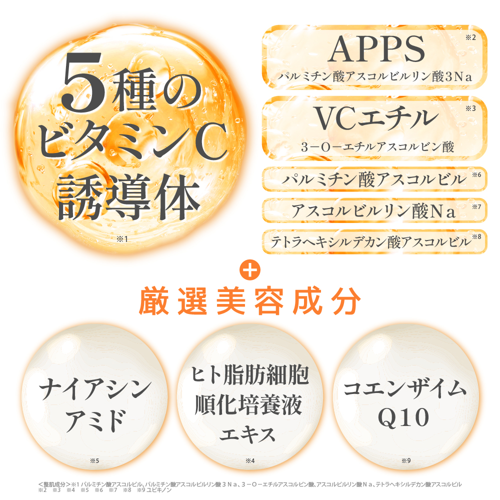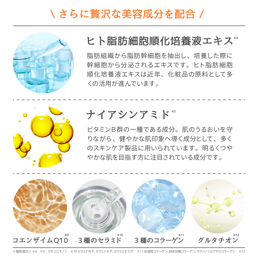 | 成分 | 水、グリセリン、BG、ヒト脂肪細胞順化培養液エキス、ヒト遺伝子組換オリゴペプチド-1、ヒト遺伝子組換ポリペプチド-11、パルミチン酸アスコルビル、パルミチン酸アスコルビルリン酸3Na、3-O-エチルアスコルビン酸、アスコルビルリン酸Na、テトラヘキシルデカン酸アスコルビル、グルタチオン、ナイアシンアミド、アラントイン、ヒアルロン酸Na、水溶性コラーゲン、加水分解コラーゲン、サクシノイルアテロコラーゲン、セラミドNP、セラミドAP、セラミドEOP、フィトスフィンゴシン、ユビキノン、オリーブ果実油、グリチルリチン酸2K、アルブチン、コロイド性白金、フラーレン、スクワラン、アセチルテトラペプチド-17、マンニトール、キサンタンガム、PEG-60水添ヒマシ油、クエン酸、クエン酸Na、フェノキシエタノール、メチルパラベン、EDTA-2Na、コレステロール、ラウロイルラクチレートNa、アマニ脂肪酸、カルボマー、レシチン、水添レシチン、酢酸トコフェロール、1,2-ヘキサンジオール、ポリソルベート80、ココイルサルコシンNa、エタノール |