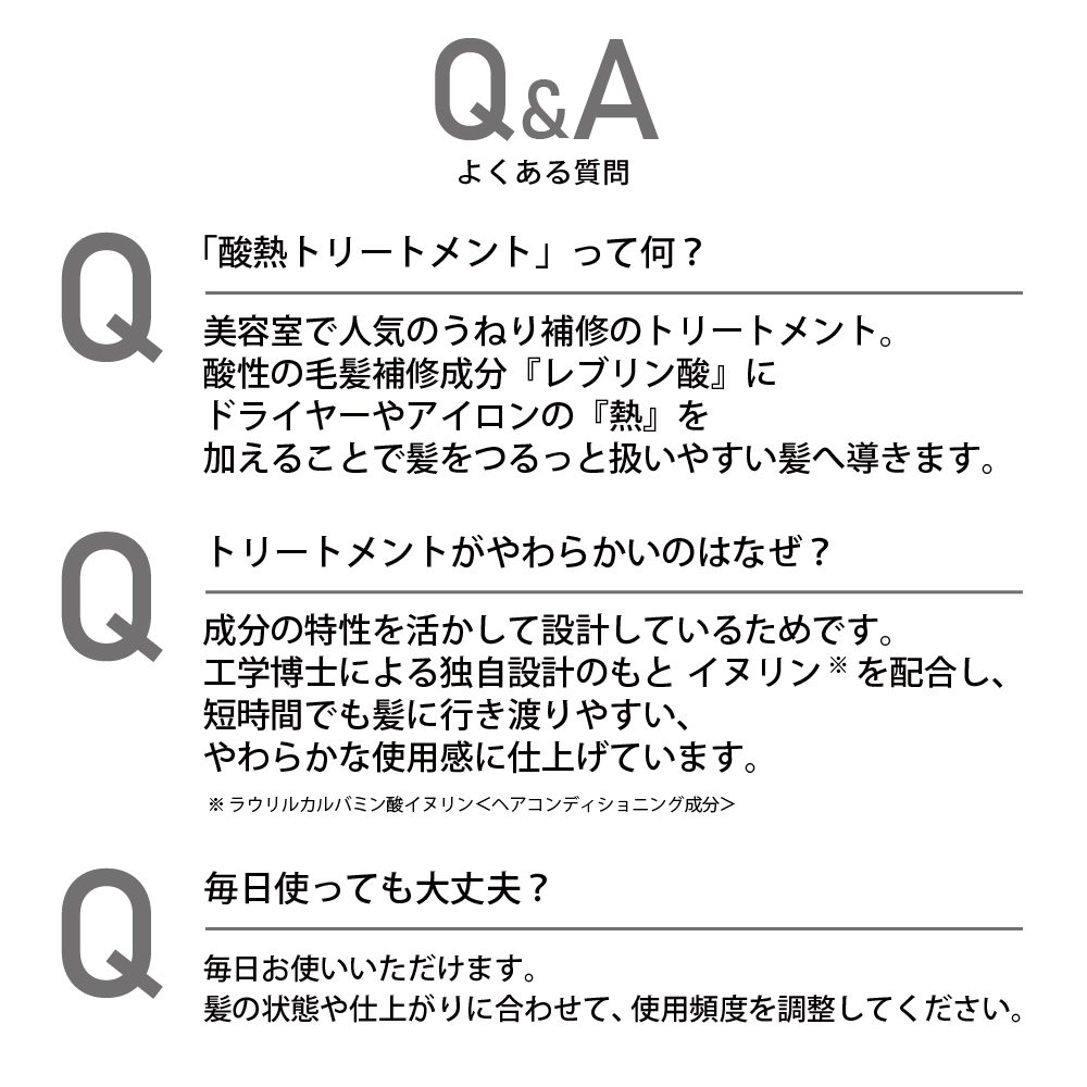 | 使用方法 | 【Step.1】シャンプーの後、しっかりすすぎ、軽く水気を切ります。 【Step.2】適量を手に取り、髪全体になじませます。その後、よくすすぎ洗い流してください。 ★2-3分程度、放置するとよりしっとりした仕上がりに。 【Step.3】タオルドライ後は、手ぐしで整えながらドライヤーでしっかり乾かしてください。 ★ドライヤーやアイロンの熱で効果UP |